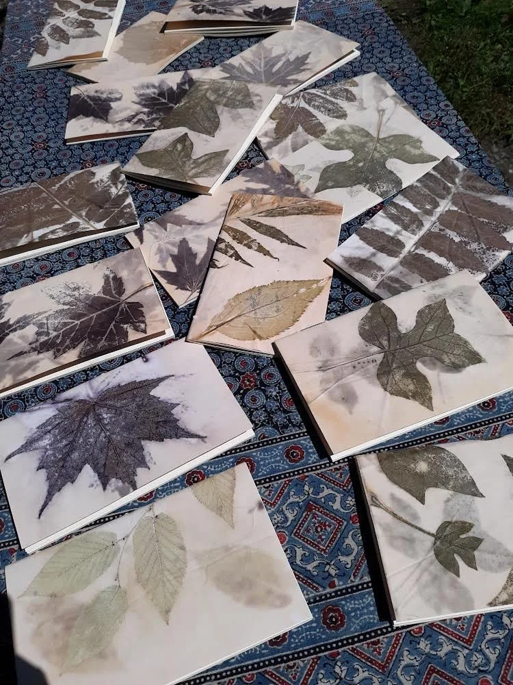 I sell my eco print journals wholesale to shops all over! These leaf journals are made using a natural dying tenique called Tannic-Iron Eco Printing. Each print is folded, filled with paper, and hand bound with linen thread.  For more info on Eco Printing check out my techniques and bindings page.